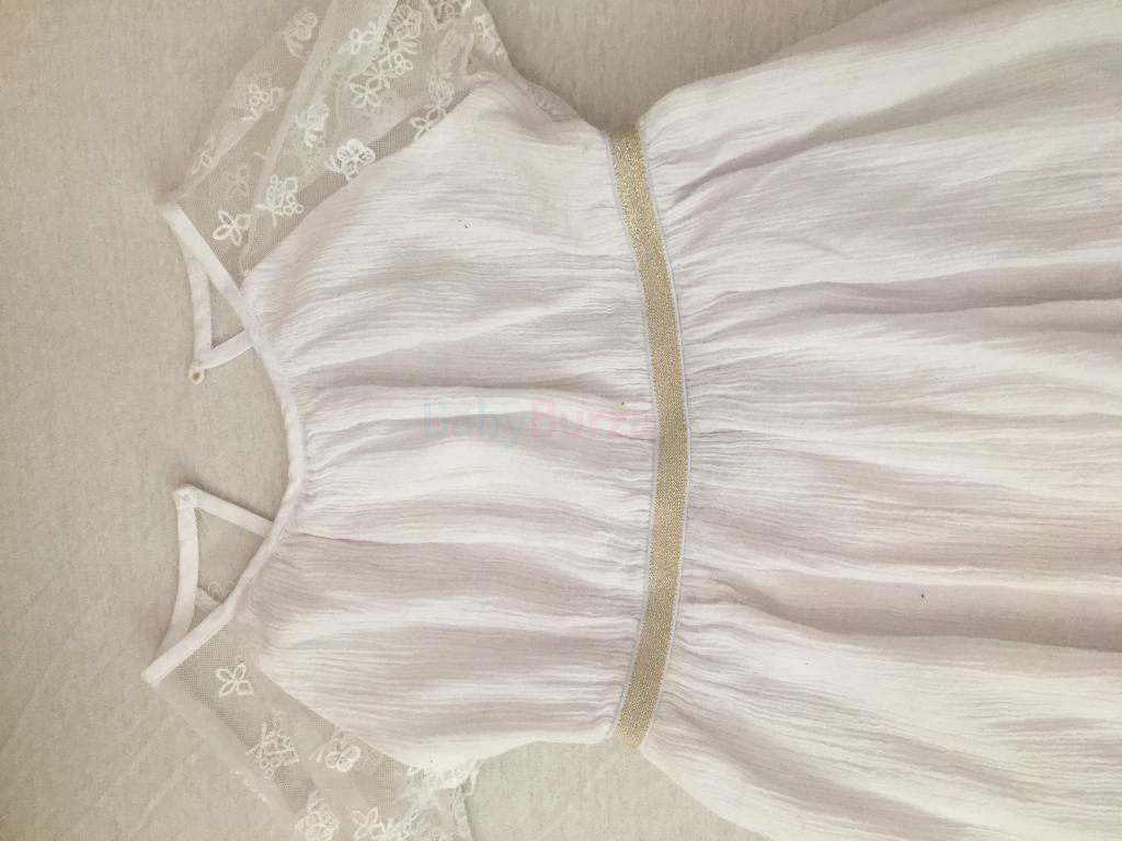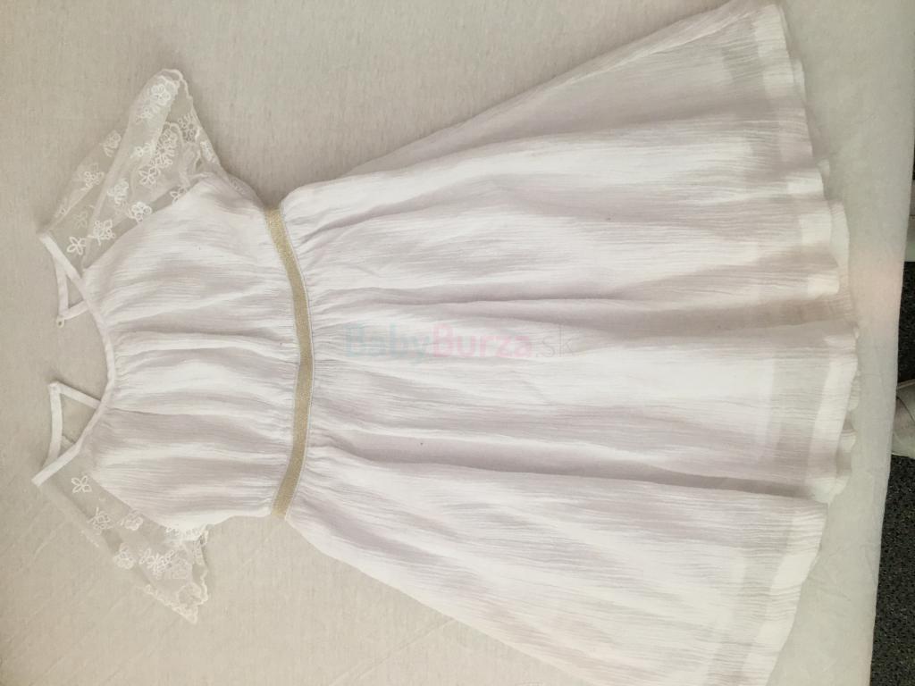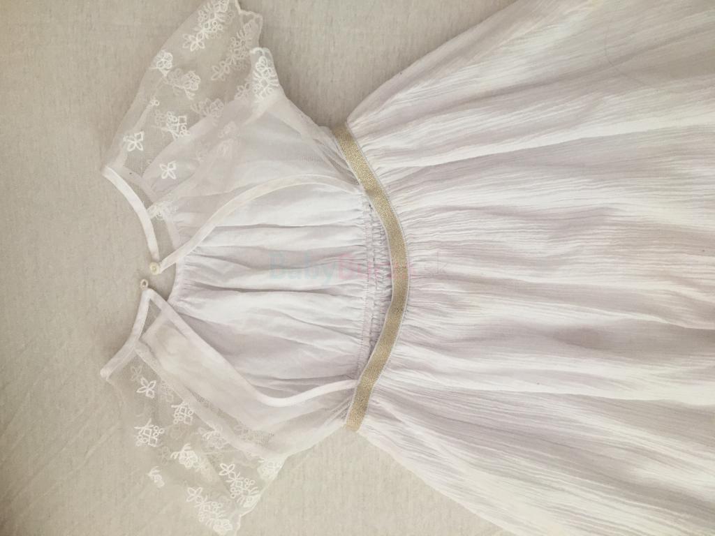 Ľahké letné šatočky z bieleho bavlneného krepového materiálu (zn.Verbaudet), v páse nazberkané a ozdobené striebristým pásikom (gumou), rukáviky sú raglánové z priesvitnej čipky. Dĺžka sukničky je 39cm, celková dĺžka meraná vzadu je 59cm. Suknička má aj bavlnenú podšívku.Veľkosť 110cm.