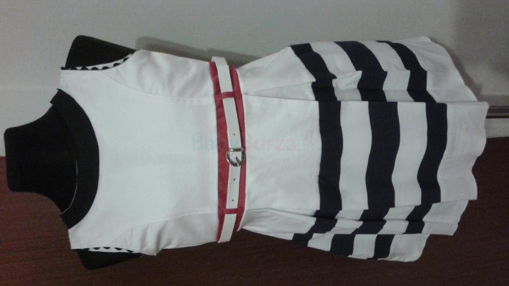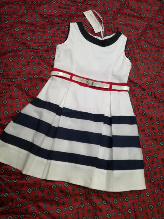 Predám nové dievčenské šaty, biele s modrými pásmi na sukňovej časti a modrými detailami okolo krku a ramien. Červený pás vkladaný pod biely koženkový opasok. Sukňová časť je rozšírená, vpredu a vzadu sú po 2 skladané záhyby. Šaty sú podšité, bez rukávov, zapínanie na zips, materiál 100% bavlna. Výrobca Taliansko. Šaty sú nové, vypredávam vlastnú predajňu. Pôvodná cena 23,62 Eur