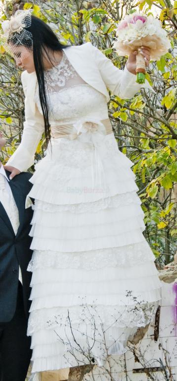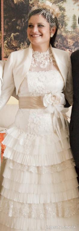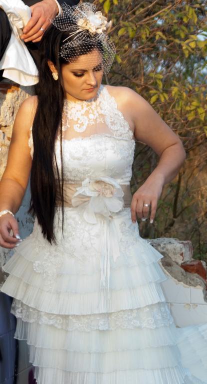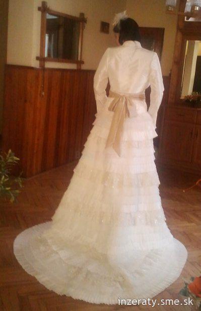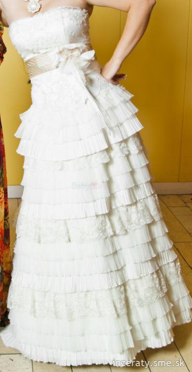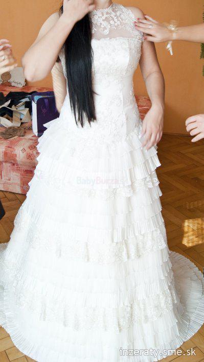 Predám exkluzívne svadobné šaty farby ivory. V okolí dekoltu sa môžu nosiť na 3 spôsoby – s čipkou, bez nej alebo s látkovým pásom okolo krku. Šaty sú vcelku, vzadu je šnurovačka. Vlečka je odnímateľná pomocou zipsu. Ten sa nachádza aj v oblasti kolien, čiže šaty sa môžu nosiť aj v krátkej verzii, ideálne napr. po polnoci. Nosené len raz na mojej svadbe a vyčistené v čistiarni v 100% stave. Veľkosť 38-40, moja výška je 170 cm, ale dajú sa upraviť. V cene sú šaty, tylová spodnička, krásny opasok, ozdoba do vlasov, bolerko a puzdro na šaty. Pôvodná cena: 700 €