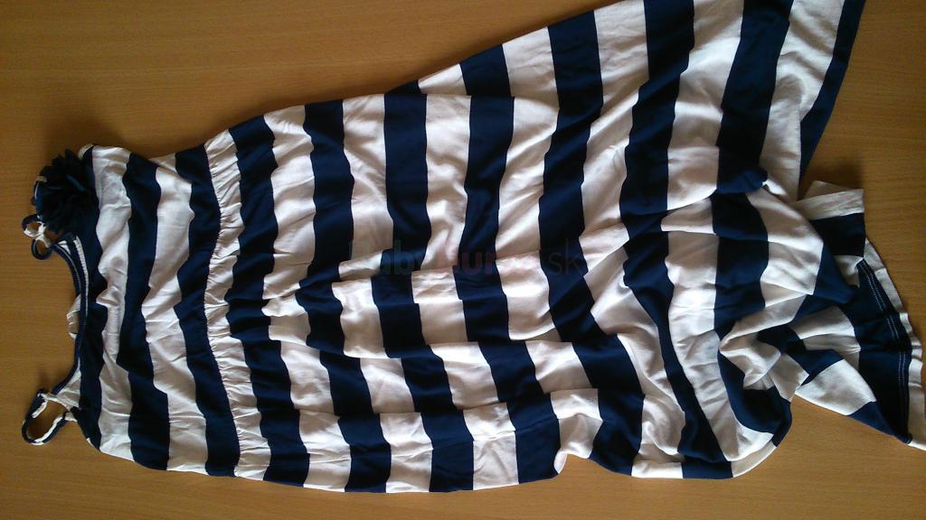 Biele s modrými pruhmi sú málo nosené po jednom dieťati na vrchnej časti sa nachádza tmavomodrá ruža a v polovici hrudníka sú mierne stiahnuté gumičkou, dcére to vychádzalo priamo pod prsiami, ramienka sa dajú prispôsobiť postave, dĺžka šiat od ramienok až po spodnú časť je 102 cm a šírka hrudníka je približne 34 cm pôvodná cena 20 Eur